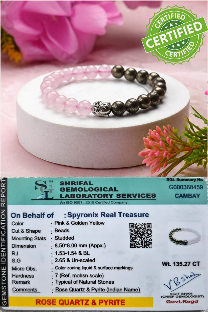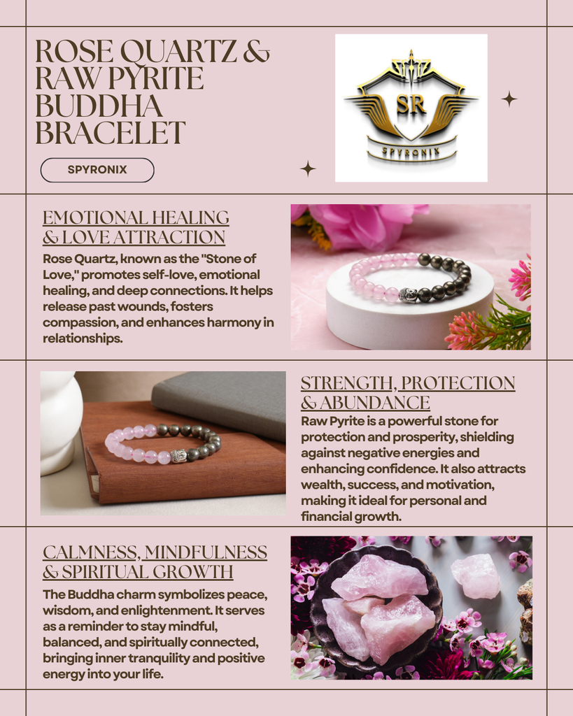 "Our Rose Quartz and Pyrite Stone Bracelet with Buddha Charm is a unique and powerful accessory that attracts love, abundance, and peace into your life. Rose Quartz is a stone that balances the heart chakra, promoting love and compassion in your life. Pyrite is a powerful stone that attracts abundance, success, and positivity. The Buddha Charm is an essential part of this bracelet, promoting peace, patience, and self-confidence in your life.